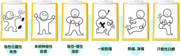 急性化膿性疾患、末梢神経性疾患、急性・慢性湿疹、一般創傷、熱傷、凍傷、汗疱性白癬