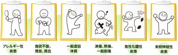 アレルギー性疾患、食欲不振、倦怠、貧血、一般虚弱体質、凍傷、熱傷、一般創傷、急性化膿性疾患、末梢神経性疾患