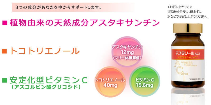 アスタリールアクトは、アスタキサンチン、トコトリエノール、ビタミンCを配合した栄養補助食品(サプリメント)です。